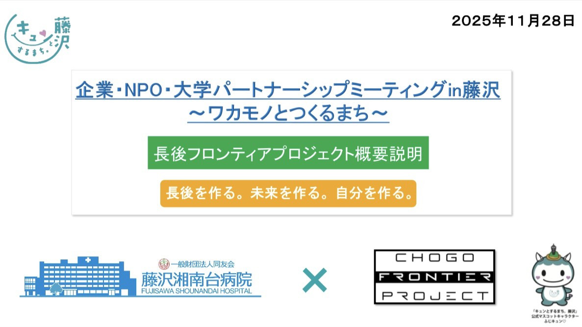 2025年11月28日(金)に、湘南台市民センターで開催された「企業・NPO・大学 パートナーシップミーティングin藤沢~ワカモノとつくるまち~」にて、藤沢湘南台病院さんと合同で登壇させていただきました!