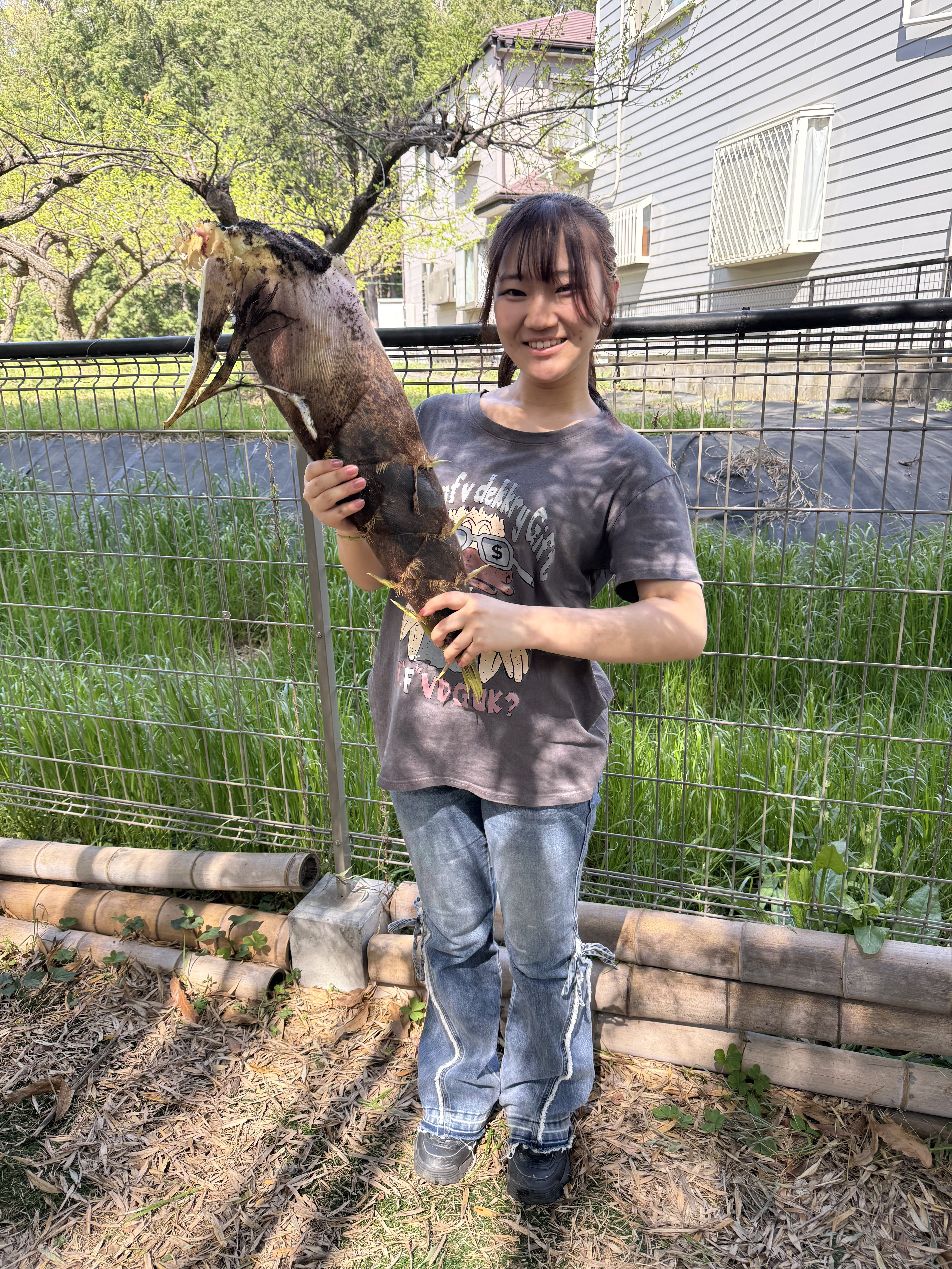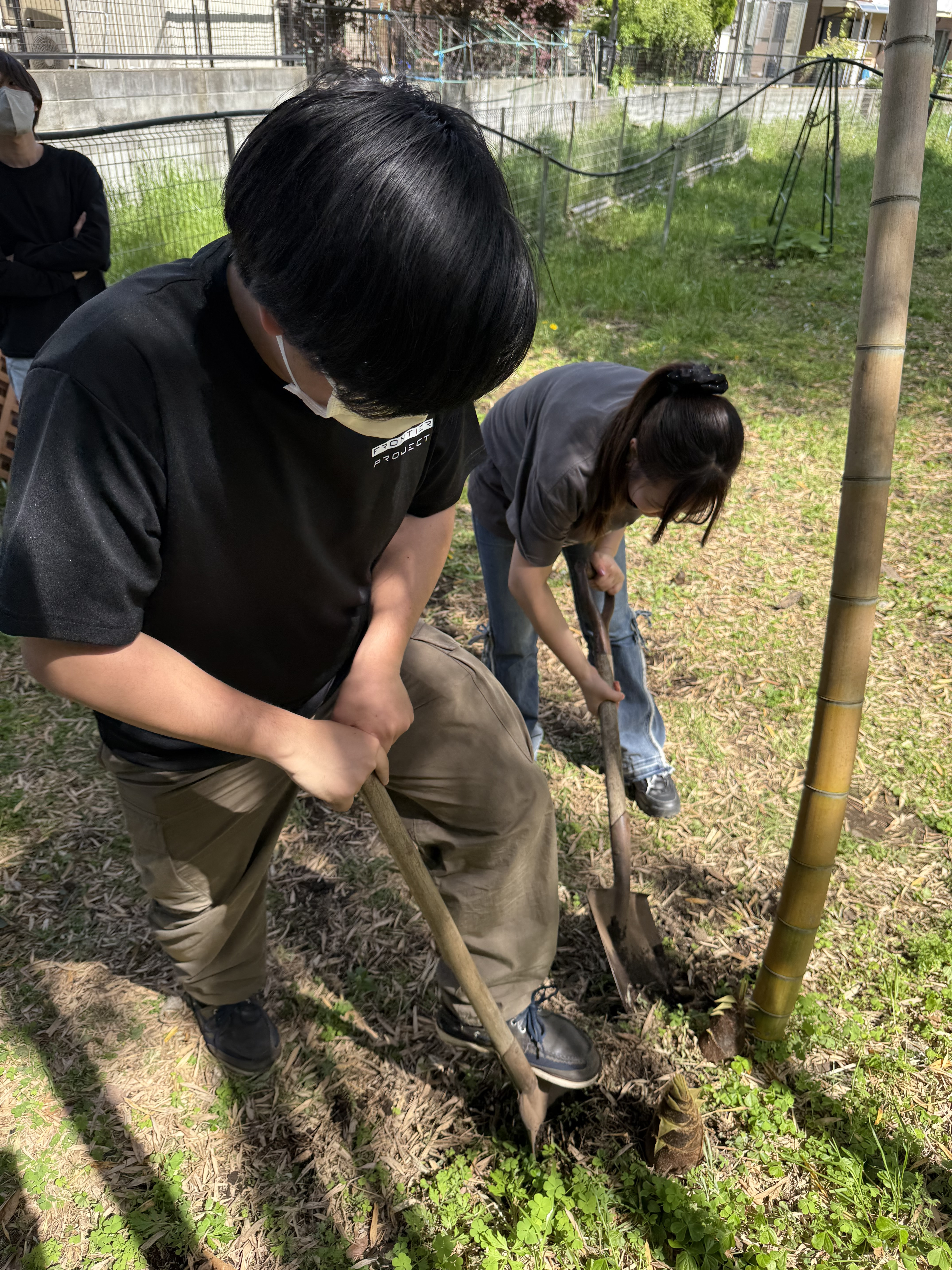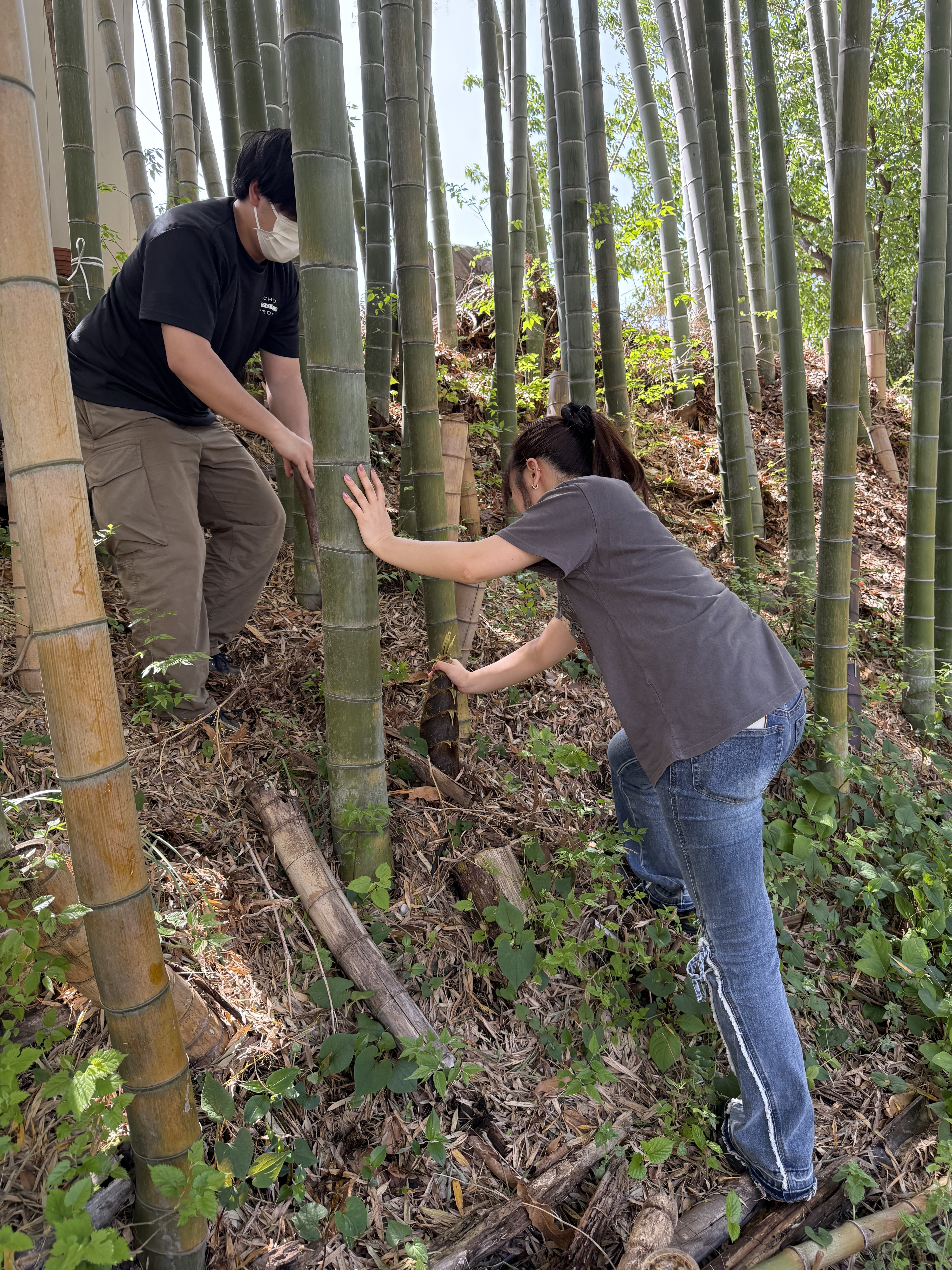 たくさんのタケノコが生えており、みんなで力を合わせて収穫しました!