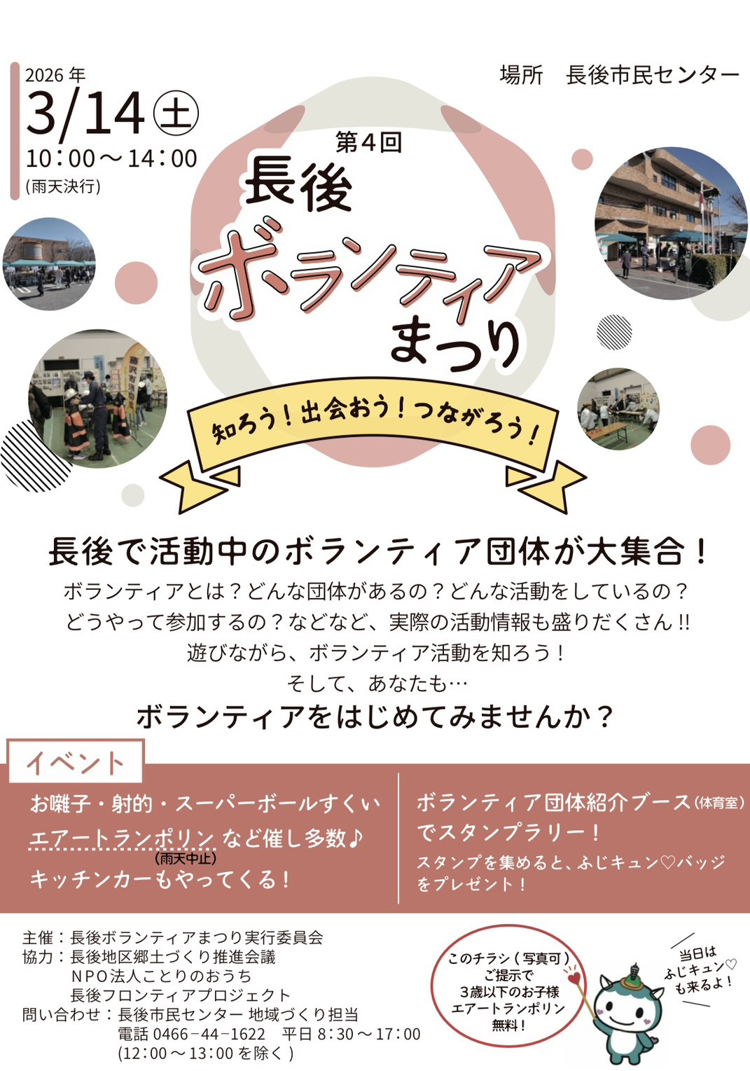 3月14日(土)の10時00分~14時00分まで、長後市民センターにて開催される「第4回長後ボランティアまつり」に参加をします!